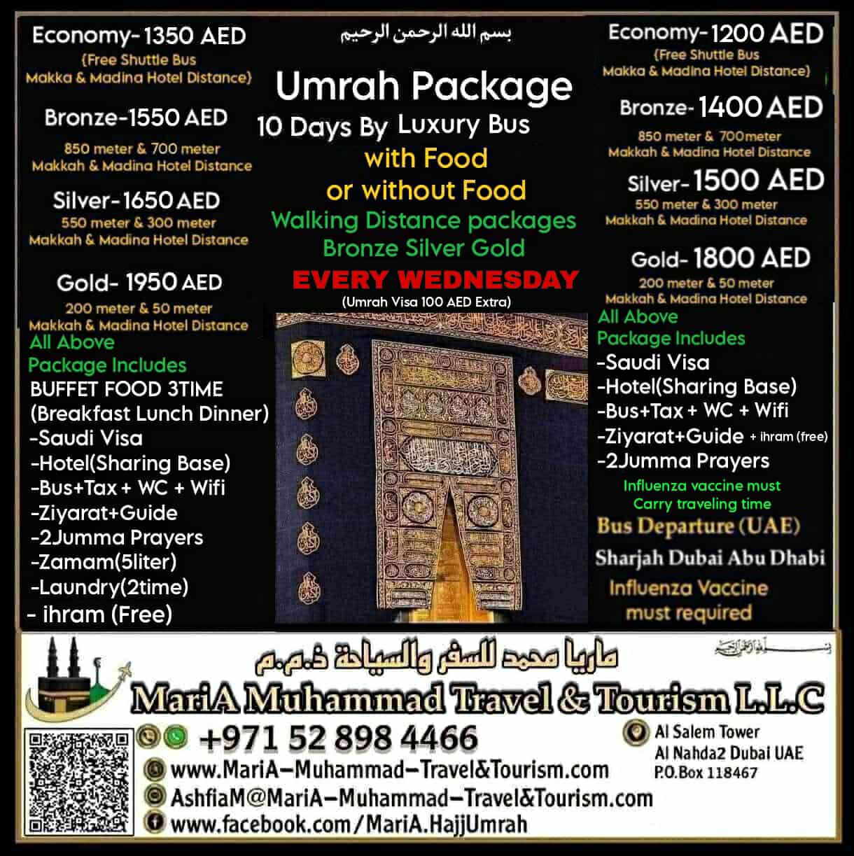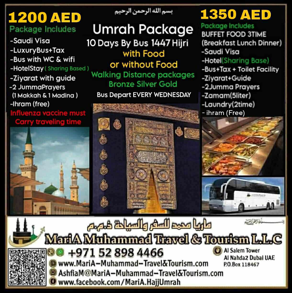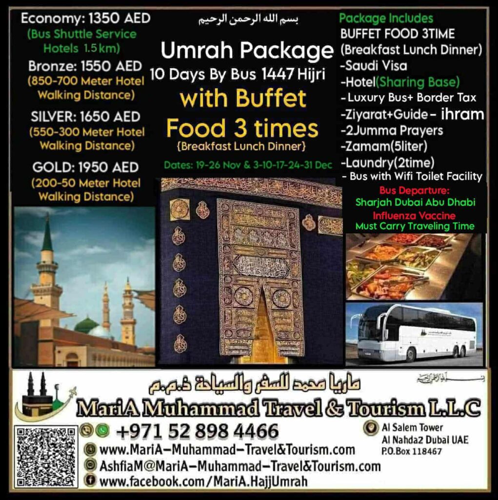 Umrah Package 10 Days by Bus Oct 2025 (6 Days Makkah & 2 Days Madina 2 Days Traveling) 🕋 BUFFET FOOD Package Includes: -Buffet Food 3times (Daily at Hotel) -(Breakfast Lunch Dinner) -Saudi Visa -Hotel Stay (SHARING BASED) -Luxury Bus Transfer -Bus with wifi and washroom facility -Border fees -Ziyarat Guide -ZamZam (5 litters) -Laundry (2 Times) -2Jumma Prayer (1 Makkah & 1 Madinah) -ihram (FREE) 🕋 NO FOOD PACKAGE INCLUDES: -Saudi Visa -Hotel Stay (SHARING BASED) -Luxury Bus Transfer -Bus with wifi and washroom facility -Border fees -Ziyarat Guide -2Jumma Prayer (1 Makkah & 1 Madinah) -ihram (FREE) 🕋 5 Times Prayer with Jamat (Makkah & Madina) by Choosing Walking Distance packages. (Bronze Silver or Gold).... BISMILLAH...🕋 🕋 Economy Package {1350 AED} ◇Free Shuttle Service Hotel 1.5km Makkah & 1km Madinah (walking Distance hotels Packages) 🕋Bronze Package {1550 AED} ◇850 mts Makkah 700 mts Madinah 🕋Silver Package {1650 AED} ◇550 mts Makkah 300 mts Madinah 🕋Gold Package {1950 AED} ◇250 mts Makkah 50 mts Madinah Notes: ◇All Price As per Indian Nationality, All other Nationality 100 AED Extra for Umrah Visa. ◇Price for Dates:19-26Nov & 3-10-17-24-31Dec ◇Bus Departure: Sharjah Dubai & AbuDhabi ◇Influenza Vaccine must carry traveling time •No Vaccine No Entry Saudi Arabia •Vaccine Price is not included in any packages. ◇Booking will closed 5 Days before DepartureDate ◇Because of Hotel Distances Price are different ◇For family room contact us for quotation ◇◇Saudi Tourist EVisa on DoneBased (Send to embassy application or New application) we offer Visa in 24hr on selected Nationality. ◇Saudi Tourist EVisa Single Entry 90 Days or multi Entry 1 Year depending on Nationality.