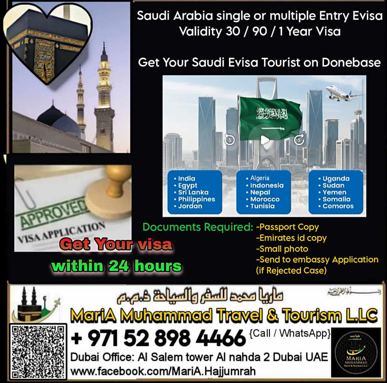 Get your Saudi Tourist single or multi entry Evisa on Donebase (Price as per nationality) 🕋New application or Send to embassy Case Process time 24 hours to get approved For Visa Process 052 898 4466 🕋Saudi Tourist Evisa on Donebase Eligible Countries: India Egypt Sri lanka Philippines Jordan Indonesian Morocco Sudan Tanzania Lebanon Uganda Yemen Somalia Comoras Algeria Tunisia Nepal Note: (Pakistan Bangladesh Afghanistan Nationality Saudi Tourist Evisa as of now not possible) only Umrah visa possible for them.