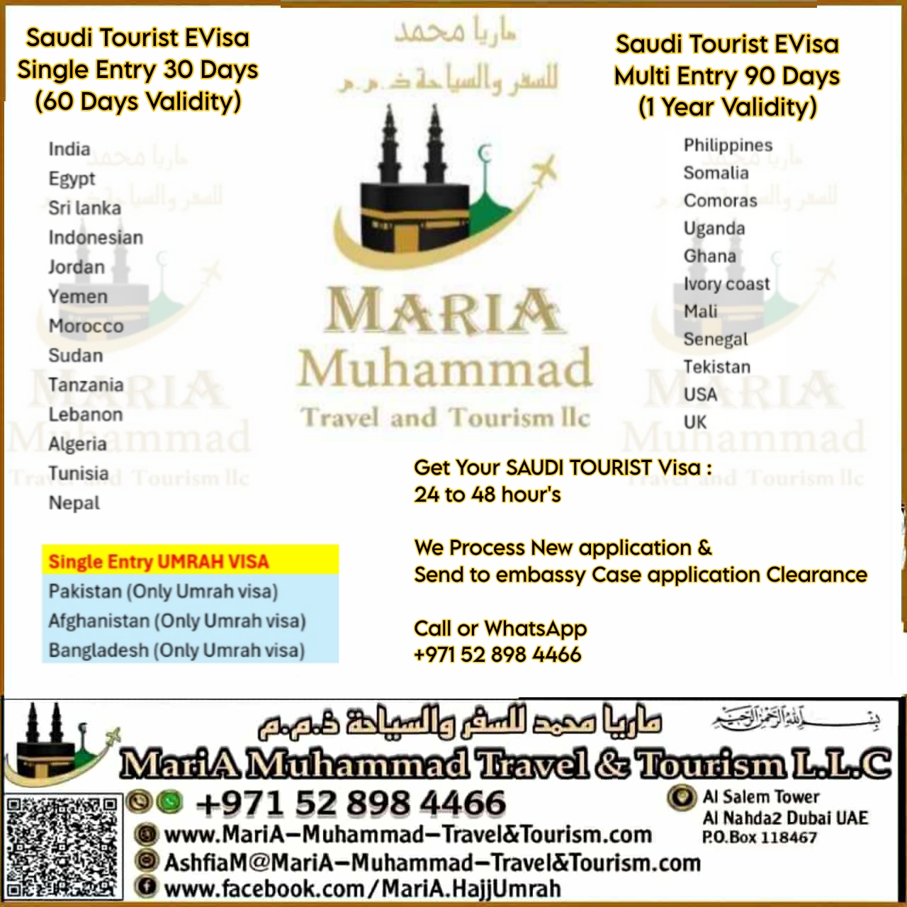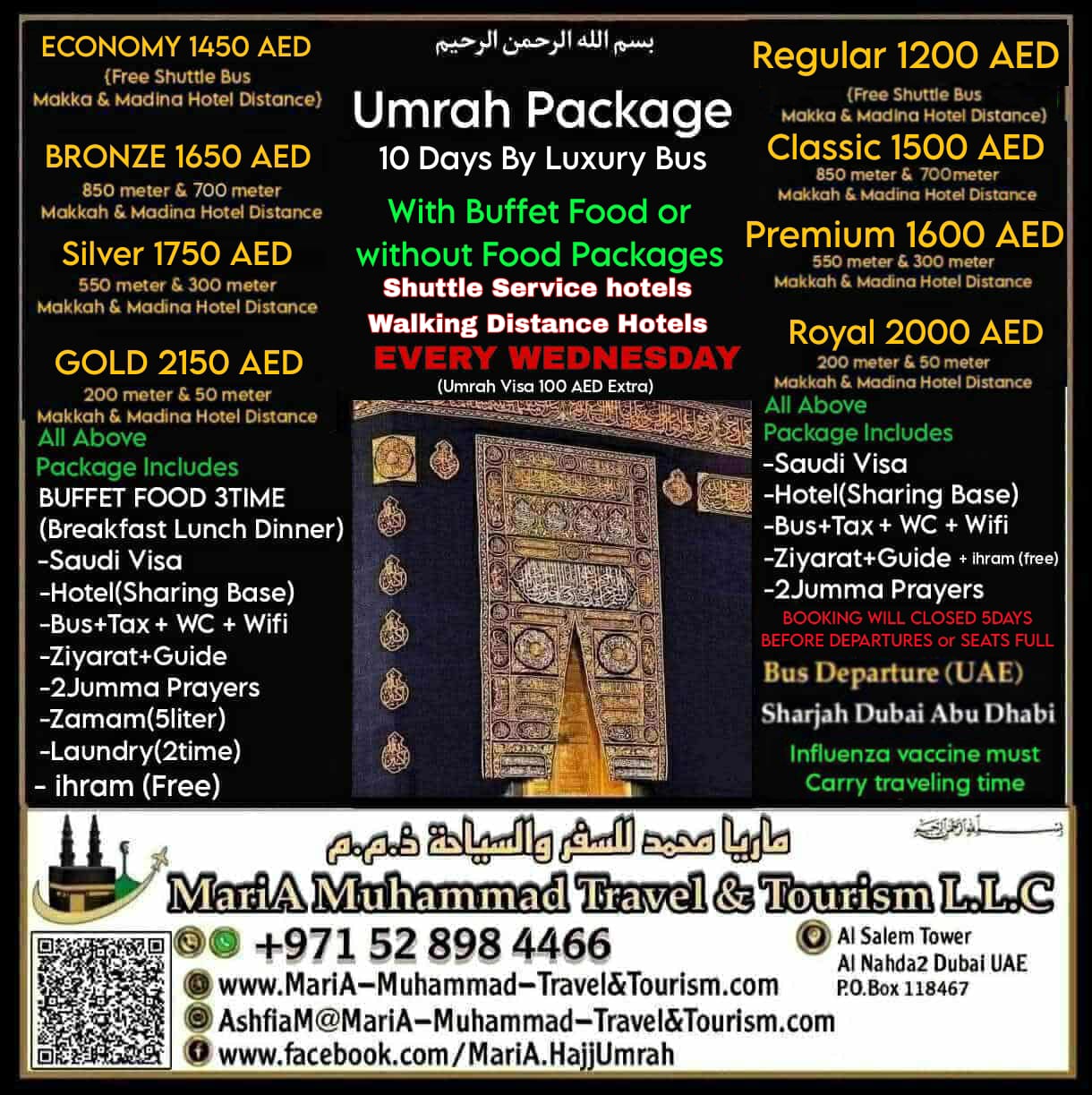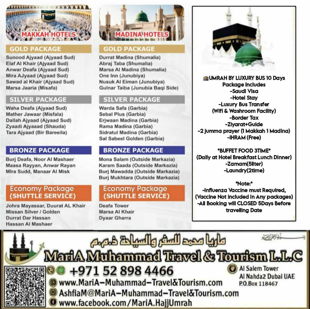 ◇Umrah Visa 100 AED EXTRA ◇Booking will closed 5 Days before DepartureDate ◇Because of Hotel Distances Price are different ◇For family room contact us for quotation ◇Influenza vaccine must Carry traveling time and fees for vaccine is not included in any our packages. ◇Saudi Tourist Visa on DoneBased (New application or send to embasy application) Get your visa In 24 hours (in sha Allah) ◇Saudi Tourist Visa Single Entry 30 Days ◇Umrah Visa Single Entry 30 Days ◇Saudi Multiple Entry visa 1 Year ☆Easy & Quick Process Less Documents ☆Best Service Guaranteed. ◇Bus Tickets ◇Dubai Visa 2 years (Freelance Visa) ◇Air Tickets ◇Hotel Booking and much more... 🕋 MariA Muhammad Travel And Tourism L.L.C