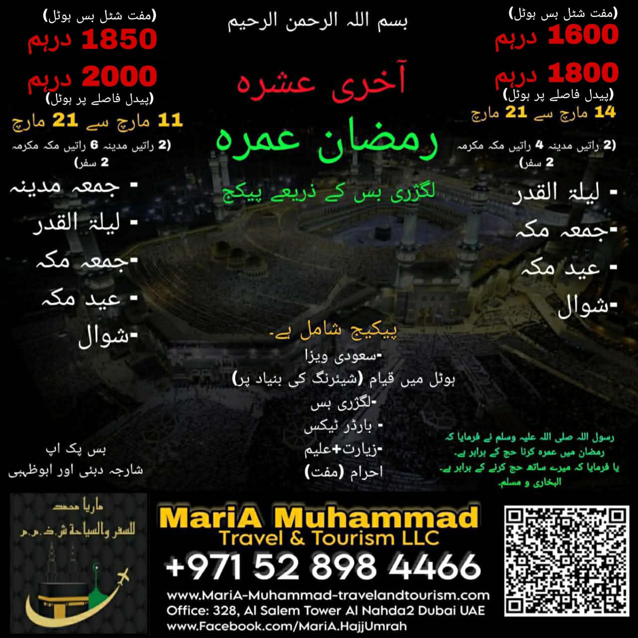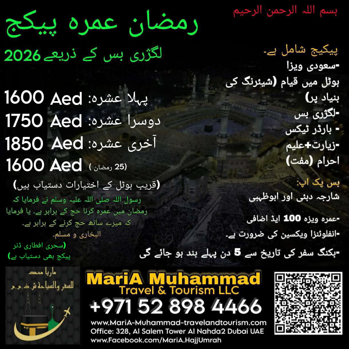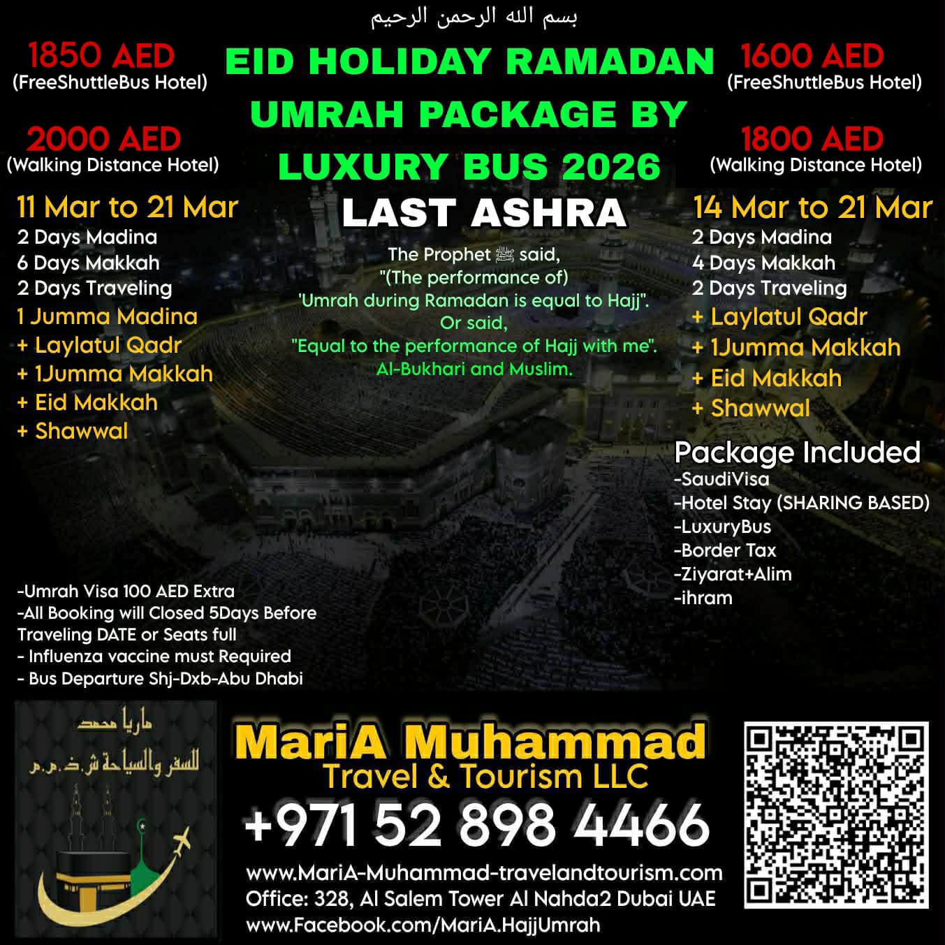 ◇Umrah Visa 100 AED EXTRA ◇Booking will closed 5 Days before DepartureDate ◇Because of Hotel Distances Price are different ◇For family room contact us for quotation ◇Influenza vaccine must Carry traveling time and fees for vaccine is not included in any our packages. ◇Saudi Tourist Visa on DoneBased (New application or send to embasy application) Get your visa In 24 hours (in sha Allah) ◇Saudi Tourist Visa Single Entry 30 Days ◇Umrah Visa Single Entry 30 Days ◇Saudi Multiple Entry visa 1 Year ☆Easy & Quick Process Less Documents ☆Best Service Guaranteed. ◇Bus Tickets ◇Dubai Visa 2 years (Freelance Visa) ◇Air Tickets ◇Hotel Booking and much more... 🕋 MariA Muhammad Travel And Tourism L.L.C